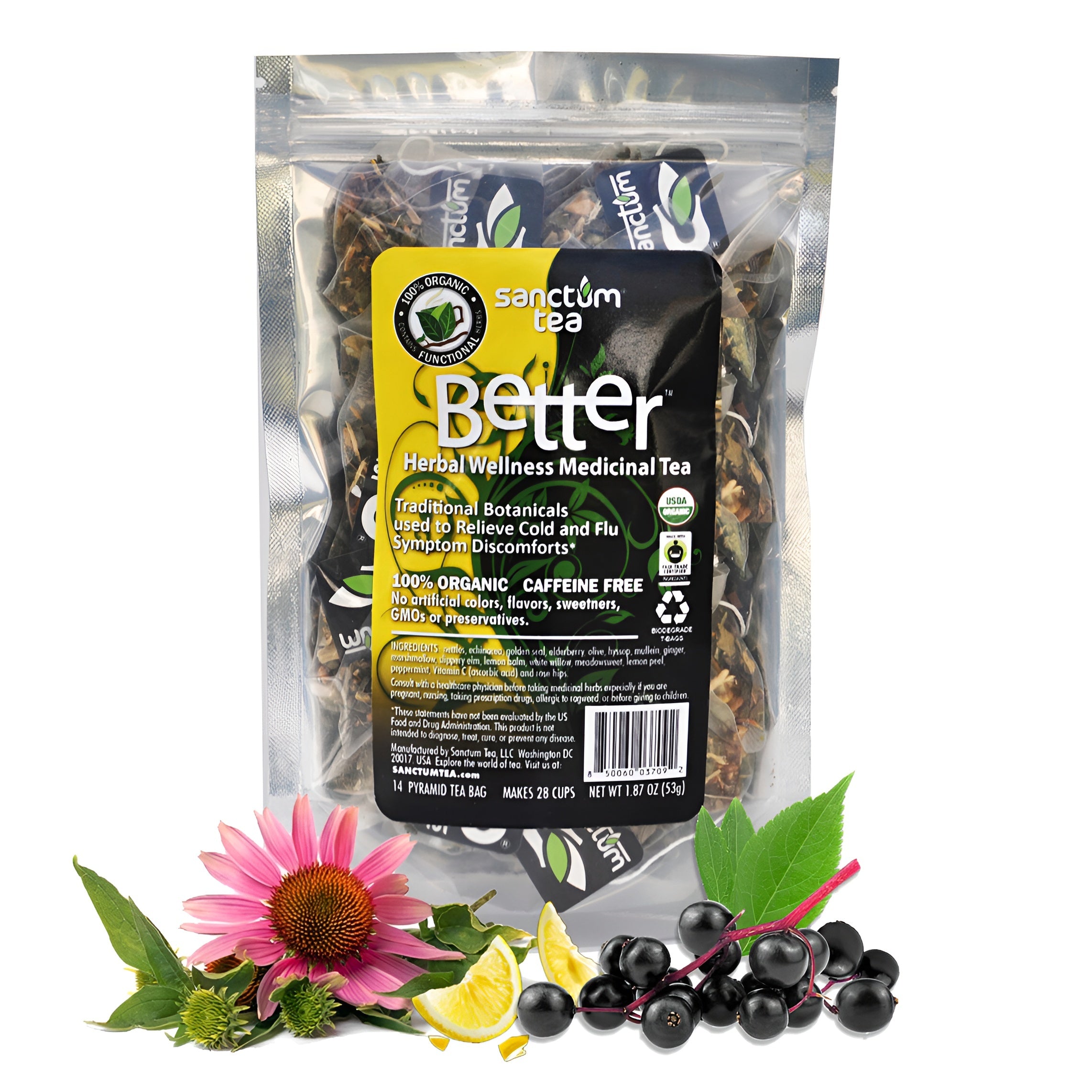 BETTER— For Cold & Flu Relief. When the season turns cold and the body grows weary, BETTER rises like a quiet guardian. This soothing organic blend draws on old-world wisdom and modern wellness to help soften the discomforts of cold and flu, easing the edges so you can find peace again.